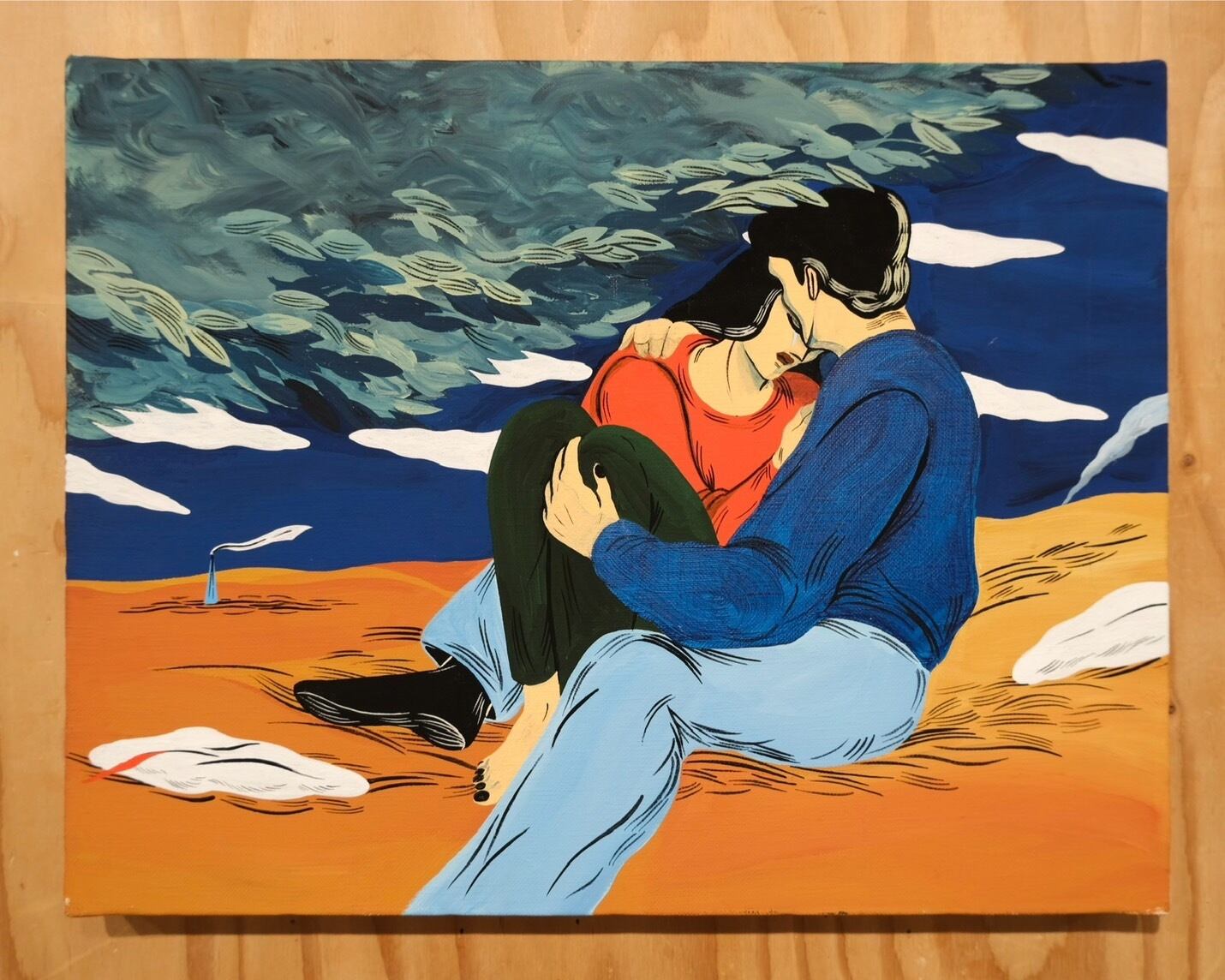 アクリルによる鮮やかな色彩とシュールなタッチの人物画を得意とする。
