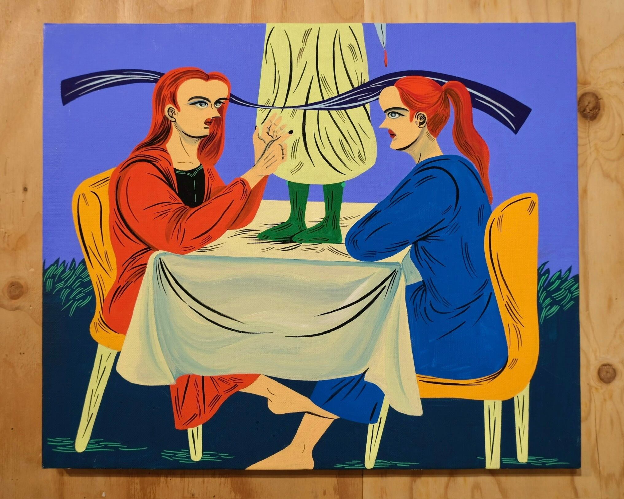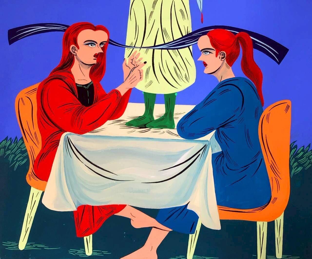 アクリルによる鮮やかな色彩とシュールなタッチの人物画を得意とする。