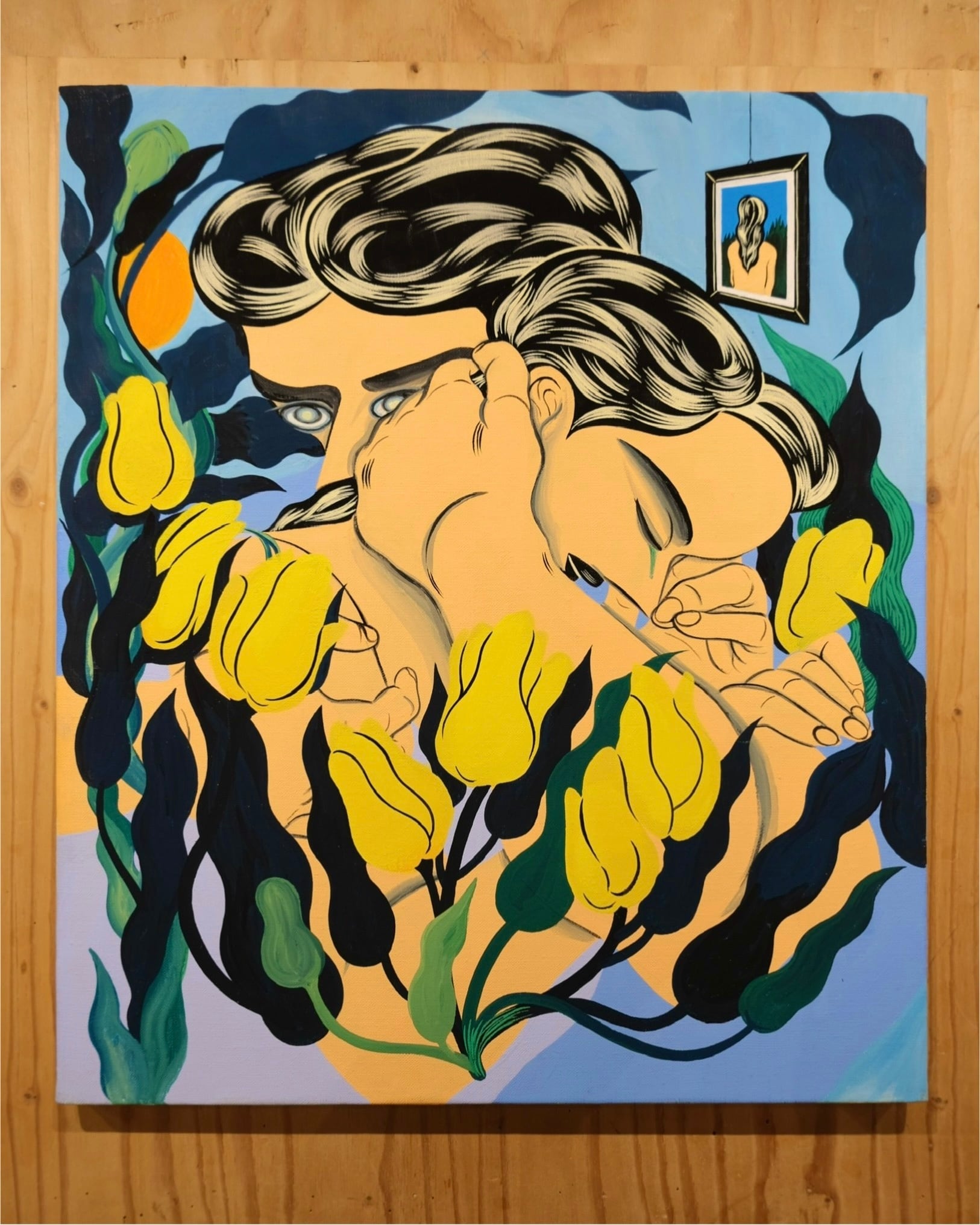 アクリルによる鮮やかな色彩とシュールなタッチの人物画を得意とする。