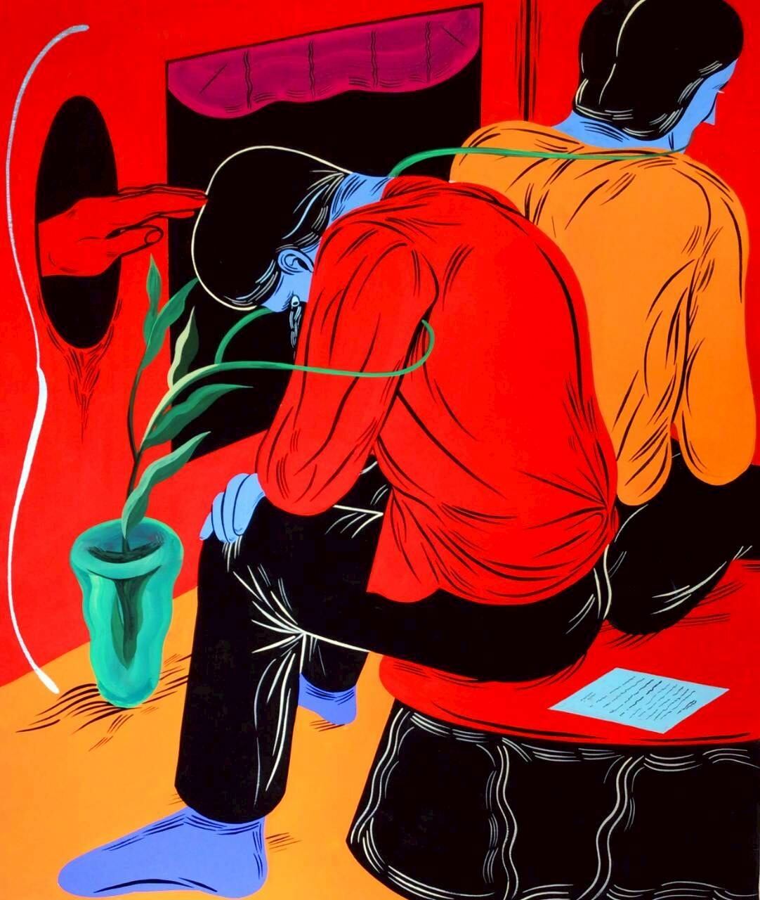 アクリルによる鮮やかな色彩とシュールなタッチの人物画を得意とする。