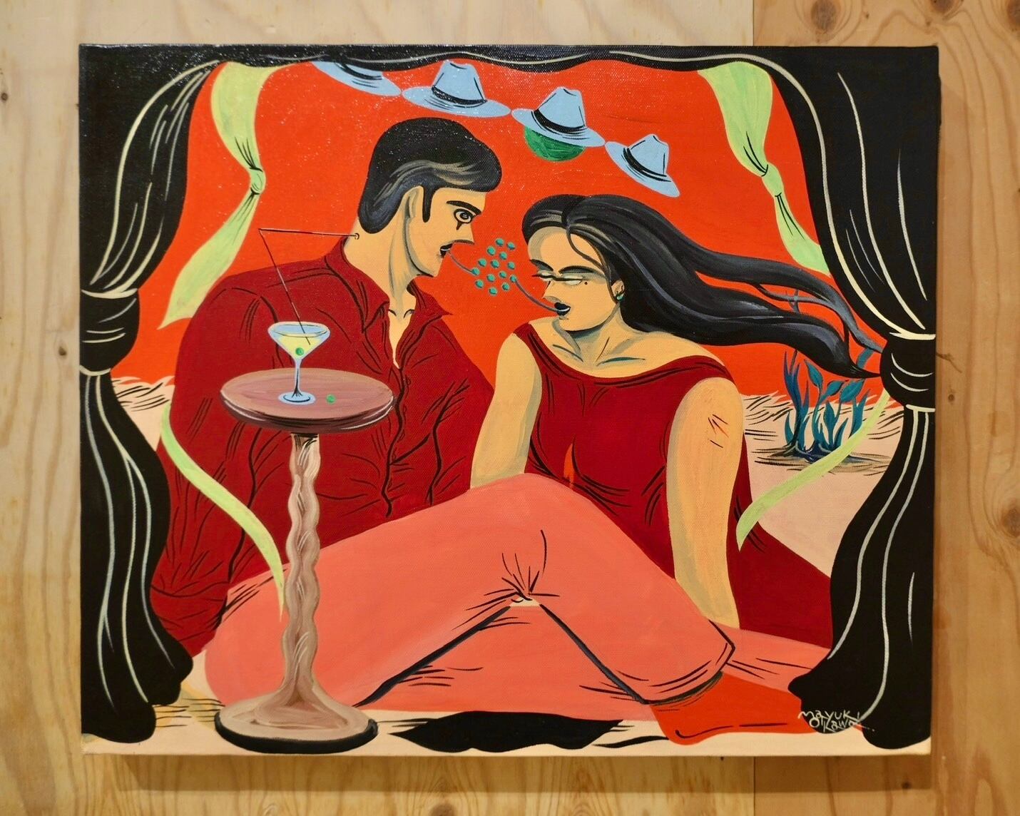 アクリルによる鮮やかな色彩とシュールなタッチの人物画を得意とする。