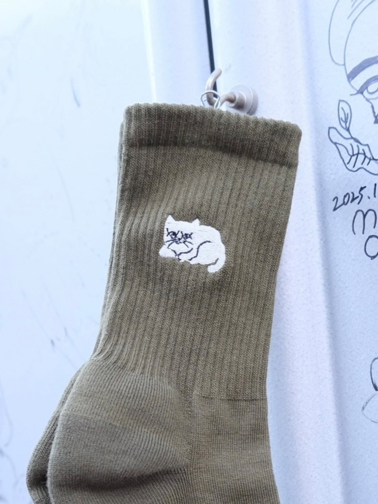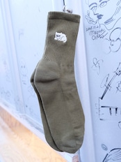大橋さんの作品「おやすみ」(オフレコに原画飾っています)の人気の猫スウェットに加えて、ショート丈の猫くつ下をつくりました。