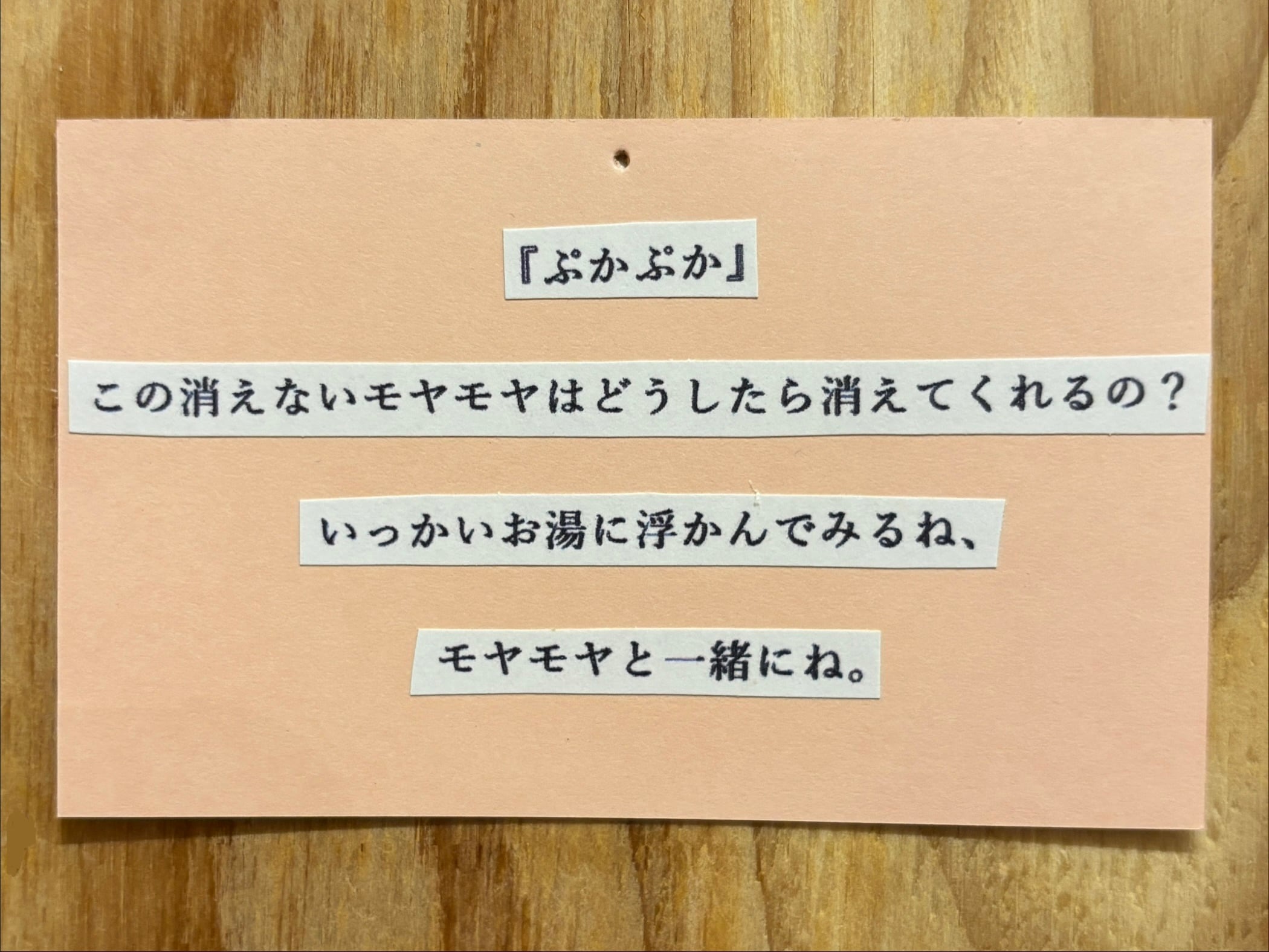 キャプション : この消えないモヤモヤはどうしたら消えてくれるの? いっかいお湯に浮かんでみるね、 モヤモヤと一緒にね。